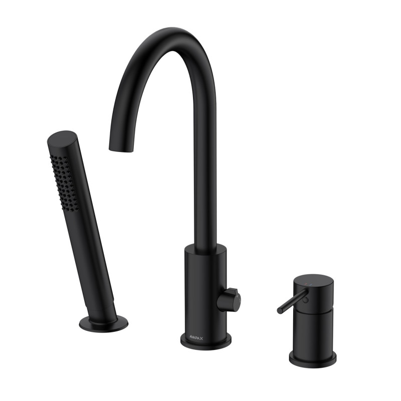 Bateria wannowa 3-otworowa (kod: ABUL231321) – kolekcja ULTIMATE marki AVAPAX. Smukła, cylindryczna forma w nowoczesnym, designerskim stylu, czarny mat podkreśla charakter industrial i premium. Satynowo-matowa powierzchnia jest odporna i łatwa w pielęgnacji, a mosiężny korpus oraz głowica ceramiczna 35 mm gwarantują wieloletnią niezawodność. Montaż 3-otworowy na rancie wanny, wysoka łukowa wylewka z przełącznikiem oraz 1‑funkcyjna słuchawka prysznicowa zapewniają pełną kontrolę nad rytuałem kąpieli – szybko napełnisz wannę idealną temperaturą i zyskasz wygodę codziennego użytkowania.