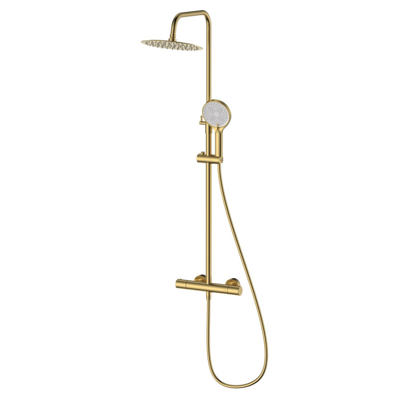 Zestaw natryskowy w wykończeniu Złoty szczotkowany Brushed Gold łączy precyzję działania z architektoniczną estetyką: smukła, cylindryczna i proporcjonalna forma, odporna szczotkowana powierzchnia oraz stabilna regulacja temperatury tworzą elegancką, trwałą i komfortową strefę prysznica.