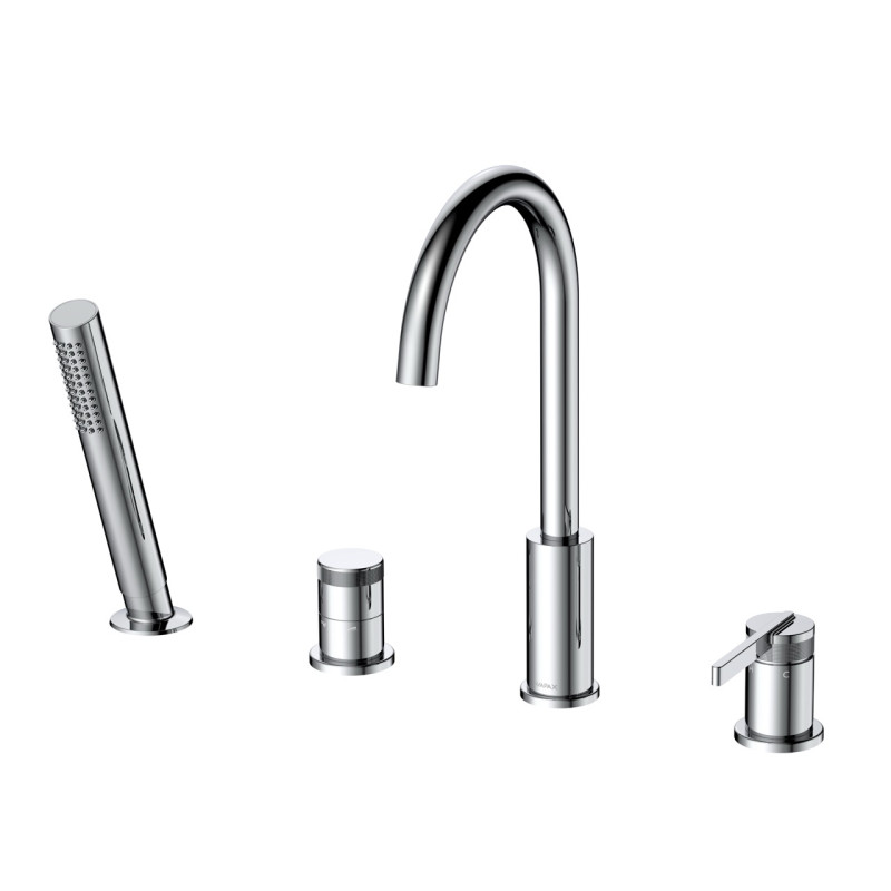 Bateria wannowa 4-otworowa (kod: ABAU241221) – kolekcja AUREVO marki AVAPAX. Smukła, cylindryczna forma z wysoką wylewką i liniową słuchawką prysznicową tworzy minimalistyczny, premium, ponadczasowy charakter. Kolor/wykończenie: chrom połysk. Materiał: mosiądz – trwały, odporny na korozję, gwarantujący długowieczność. Montaż na rancie wanny lub półce przywannowej (4 otwory) zapewnia elegancki porządek i wygodę obsługi.