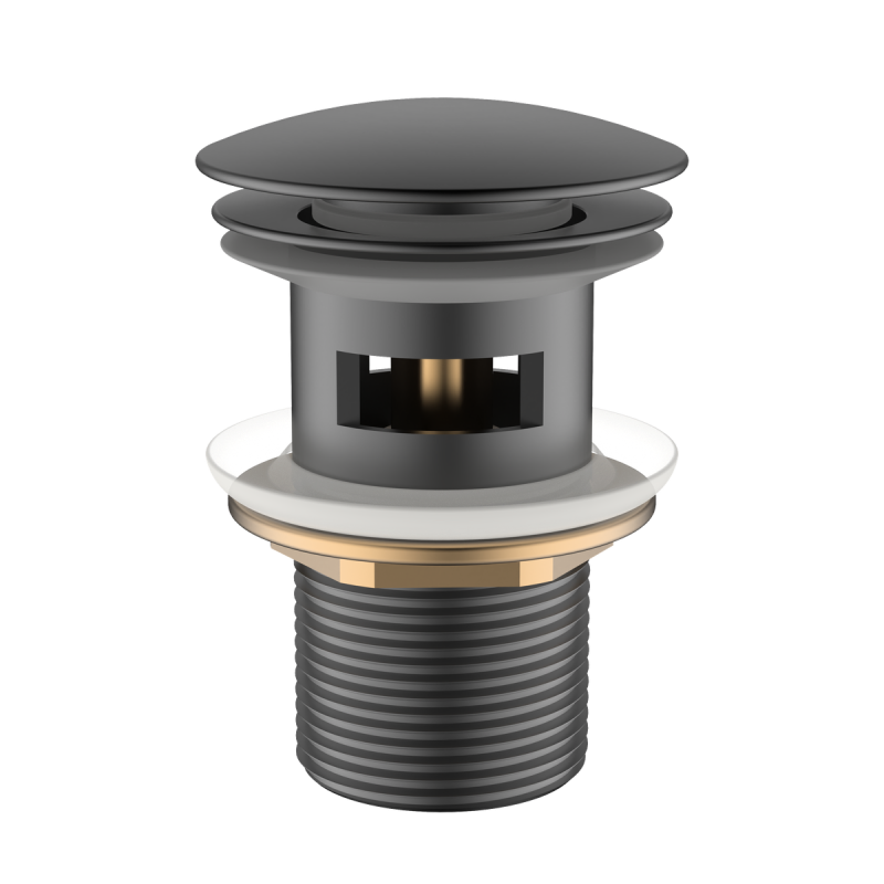 Parametry kluczowe: kod AKHY121411, EAN 5907333343024, kolor/wykończenie gun metal mat, materiał stal nierdzewna i mosiądz, kształt okrągły, forma cylindryczna, powierzchnia matowa, wymiary: Ø pokrywy 66 mm, wysokość 94 mm, Ø montażowa 41 mm, standard odpływu 1 1/4", typ click‑clack, przelew: tak.