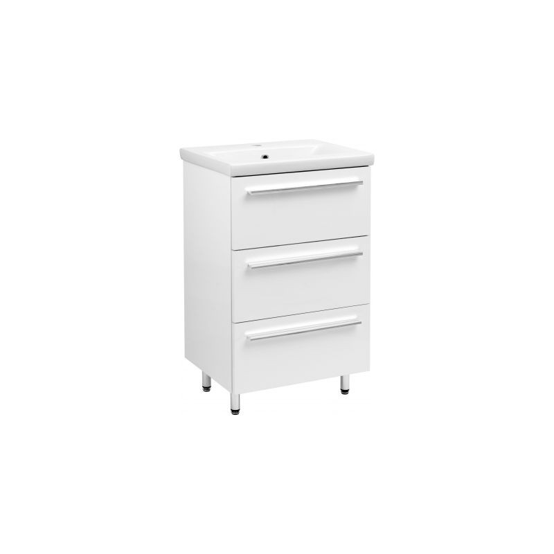 Meble z tej serii urzekają ponadczasową bielą w wysokim połysku. Korpusy oraz fronty wykonano z wytrzymałej, lakierowanej płyty, cechującej się odpornością na wilgoć i intensywne użytkowanie. Konstrukcja osadzona jest na metalowych, srebrnych nóżkach, które optycznie odciążają bryłę, a jednocześnie gwarantują stabilność i solidne podparcie. To wyrazisty detal, stanowiący znak rozpoznawczy kolekcji.