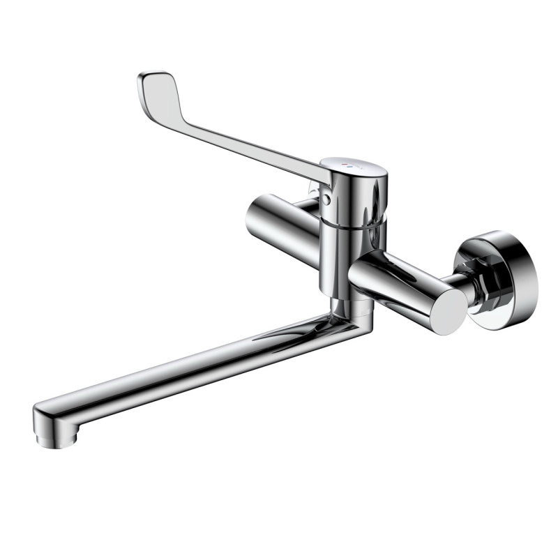 Bateria ścienna do strefy zlewozmywaka, jednouchwytowa, mieszaczowa, z dźwignią medyczną do precyzyjnej regulacji temperatury i strumienia oraz do bezpiecznej, higienicznej pracy w codziennych obowiązkach kuchennych i w przestrzeniach wymagających szczególnej czystości.