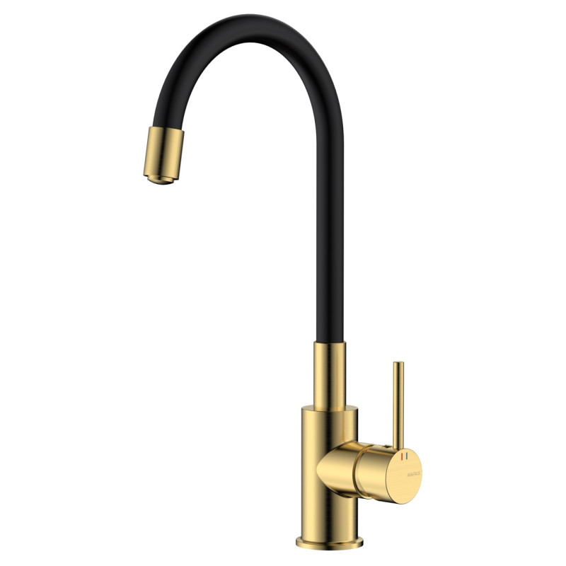 Bateria kuchenna stojąca z elastyczną wylewką (kod: ABLA7218F1) – kolekcja LAPUR marki AVAPAX. Smukła, cylindryczna forma i proporcje zaprojektowane w duchu nowoczesnej prostoty przekładają się na wygodę w codziennym gotowaniu, złoty szczotkowany korpus w duecie z czarną, elastyczną wylewką nadaje całości premium, hotelowy charakter i podkreśla trwałość konstrukcji z mosiądzu. Styl: modern premium z nutą glamour, powierzchnia: szczotkowana (korpus) i matowa (wylewka), funkcja: maksymalna ergonomia dzięki ruchomej szyjce i precyzyjnej dźwigni.