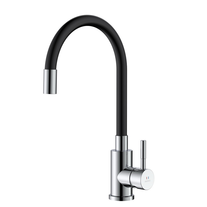 Bateria kuchenna stojąca z elastyczną wylewką (kod: ABLA7217F1) – kolekcja LAPUR marki AVAPAX. Model łączy klasyczny chrom w połysku z czarną, matową wylewką, tworząc nowoczesny, minimalistyczny charakter z industrialnym akcentem, forma smukła i cylindryczna, proporcjonalna, korpus błyszczący, wylewka elastyczna i matowa. Materiał: stal nierdzewna – trwały, odporny na korozję, gwarantujący długowieczność. Kolor/wykończenie: chrom połysk z czarną matową wylewką.