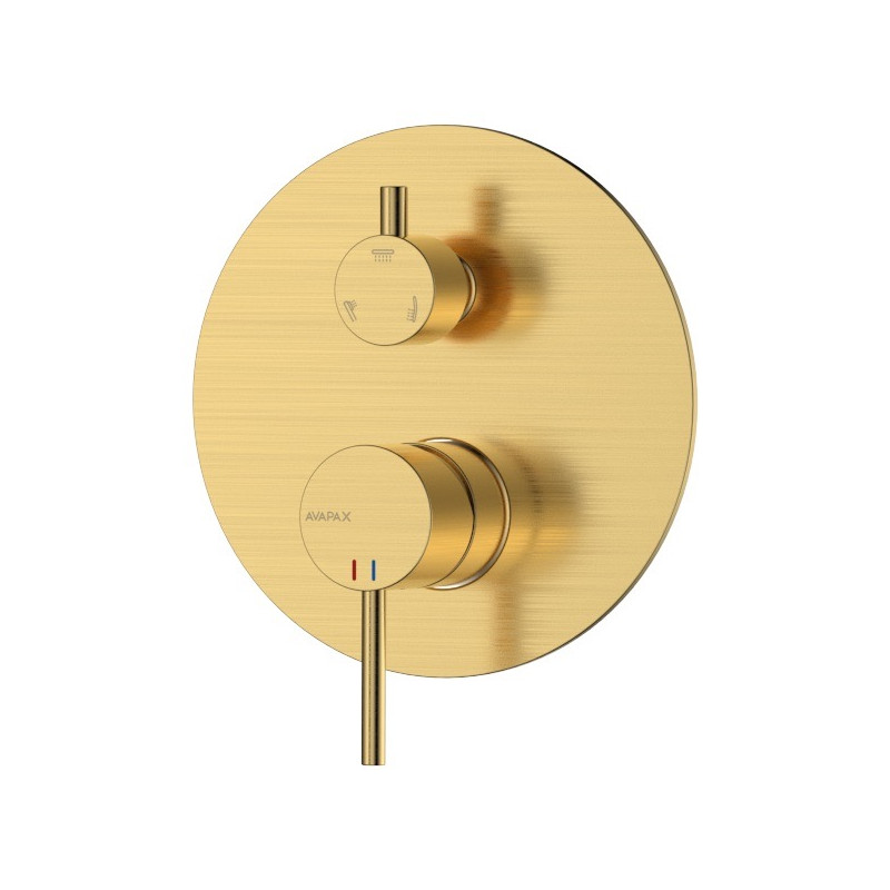Bateria prysznicowo wannowa podtynkowa trzyfunkcyjna (kod: ABUL5312C1) – kolekcja ULTIMATE marki AVAPAX. Kolor/wykończenie: złoty szczotkowany Brushed Gold. Materiał: mosiądz – trwały, odporny na korozję, gwarantujący długowieczność. Wykończenie PVD podnosi odporność na zarysowania i ułatwia czyszczenie. Smukła, cylindryczna i proporcjonalna forma z okrągłą rozetą nadaje produktowi elegancki, hotelowy charakter premium.