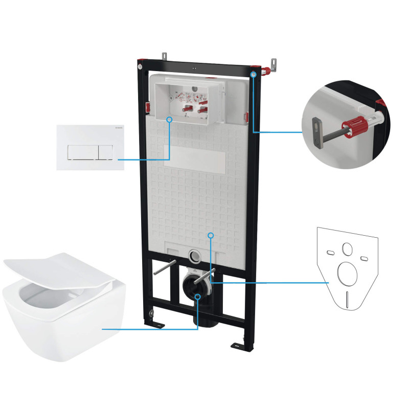 Zestaw zawiera stelaż podtynkowy o regulowanej wysokości, przeznaczony zarówno do zabudowy lekkiej, jak i przed ścianą nośną. Charakteryzuje się cichym spłukiwaniem i napełnianiem oraz możliwością podwójnego spłukiwania (3/6l), co zapewnia optymalne zużycie wody. Montaż stelaża jest ułatwiony dzięki możliwości regulacji rozstawu śrub na 180 mm i 230 mm oraz zaworowi przyłączeniowemu g1/2''.