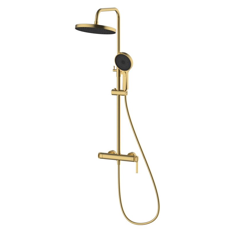 - Materiał: mosiądz (bateria), stal nierdzewna (drążek), wąż PVC, kolor/wykończenie: złoty szczotkowany Brushed Gold (PVD).