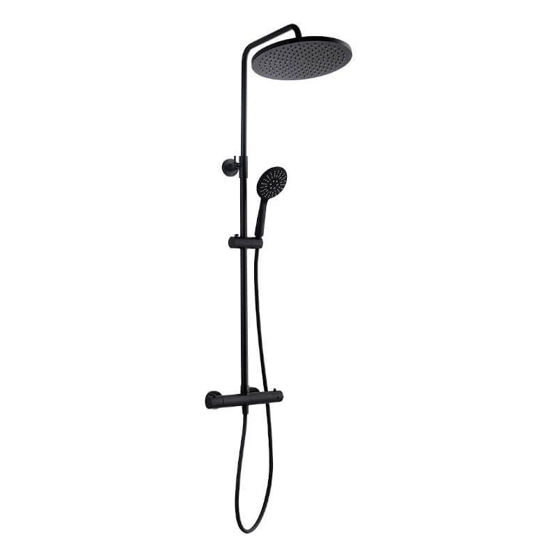Zestaw prysznicowy charakteryzuje się solidnym wykonaniem z materiałów najwyższej jakości, takich jak mosiądz, stal i plastik, co gwarantuje jego trwałość i niezawodność. Wykorzystanie materiału ABS w deszczownicy oraz PVC w wężu natryskowym zapewnia lekkość i odporność na uszkodzenia. Stylowe czarne wykończenie nadaje całości eleganckiego wyglądu, pasującego do nowoczesnych aranżacji.