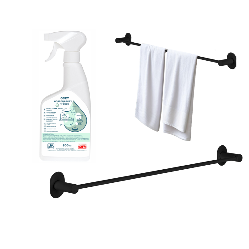 Nie zapominamy o wsparciu w utrzymaniu czystości łazienki. Razem z wieszakiem otrzymujesz gratis ocet gospodarczy w żelu – niesamowicie skuteczny środek czyszczący. Idealny do usuwania kamienia, osadów mydlanych i zacieków wodnych, zapewni blask i higieniczną czystość Twojej łazienki bez użycia szkodliwych chemikaliów.