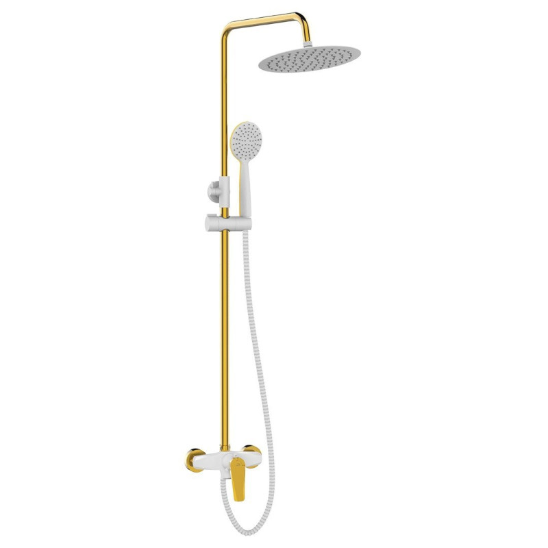 Kolumna natryskowa RUBIO jest doskonałym wyborem dla miłośników minimalistycznego, a zarazem nowoczesnego stylu. Wykończenie w kolorze białym i złotym stanowi nie tylko wizualną przyjemność, ale również łatwo komponuje się z innymi elementami wyposażenia łazienki. Do produkcji użyto wysokiej jakości materiałów, takich jak stal, mosiądz, oraz plastik, co zapewnia trwałość i ochronę przed korozją.