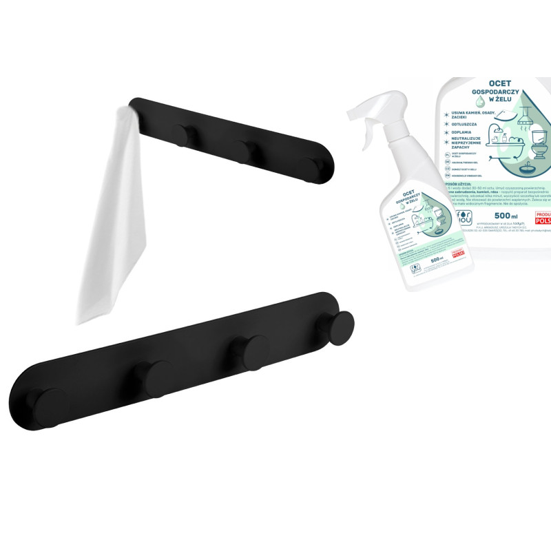 W skład zestawu wchodzi również gratisowy preparat ocet gospodarczy w żelu, który idealnie uzupełnia funkcjonalność wieszaka. Ten wszechstronny środek czyszczący sprawi, że Twoja łazienka będzie zawsze lśniła czystością. Jego naturalna formuła pozwala na skuteczną walkę z osadami i zaciekami wodnymi bez konieczności używania ostrych chemikaliów.