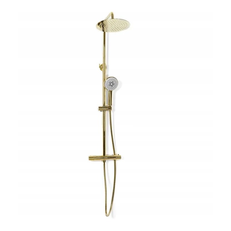 Odkryj najwyższy poziom komfortu dzięki Ekskluzywnemu Złotemu Zestawowi Natryskowemu Vincent z Termostatem. Ten luksusowy zestaw prysznicowy to nie tylko praktyczne rozwiązanie dla Twojej łazienki, ale także elegancki dodatek, który podniesie klasę każdego wnętrza. Starannie zaprojektowany, aby sprostać oczekiwaniom najbardziej wymagających klientów, zestaw Vincent łączy w sobie nowoczesny design i niezawodność.